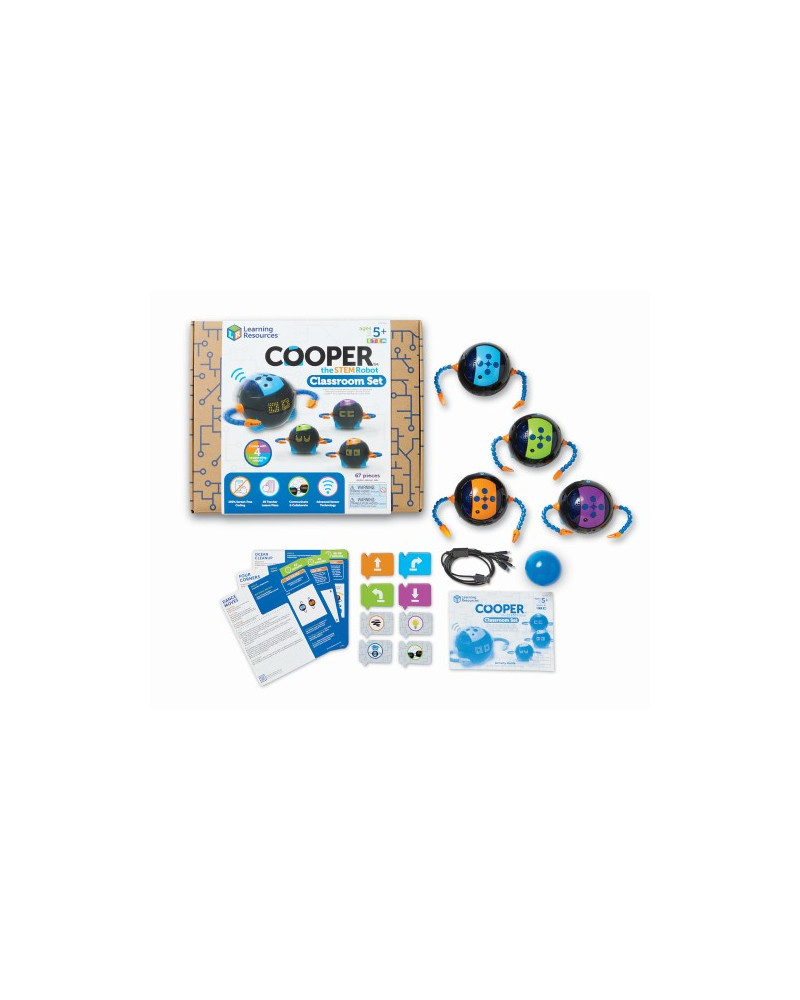 I bambini possono Premere le quattro frecce direzionali in alto, si possono inserire una sequenza di comandi. Dopo aver premuto "Go", i bambini possono vedere il loro codice funzionare davanti a loro e osservare come Cooper si muove, seguendo la serie di comandi. Le ruote robuste consentono movimenti e curve precisi su superfici piane, e può afferrare e trasportare oggetti con i suoi bracci articolati e gli artigli prensili. Il set per la classe include 4 robot Cooper, 1 cavo di ricarica a quattro vie, 1 palla da gioco, 40 schede di programmazione e una guida per l'insegnante dettagliata con 20 piani di lezione STEM. Dimensioni di Cooper 10 x 10 cm. Età 5+