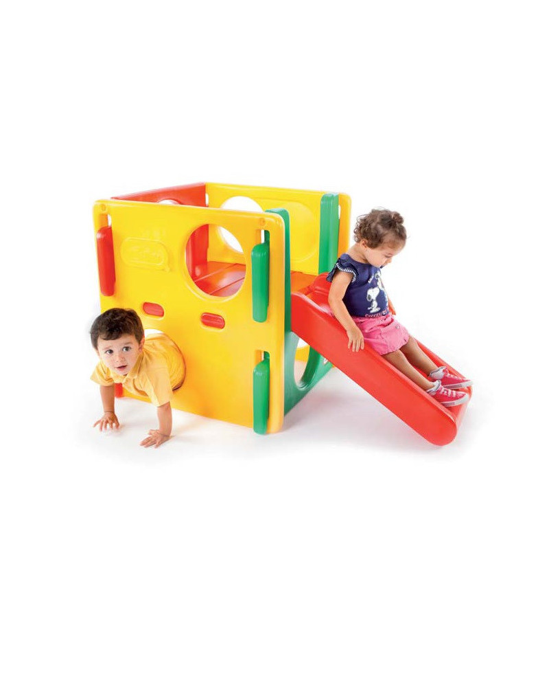 Ideale per i più piccoli che possono arrampicarsi, scivolare, strisciare e giocare a nascondino. Struttura compatta per interno o esterno. Assemblaggio senza minuteria metallica. Fornito di semplici istruzioni per un facile montaggio. Dimensioni 76x76x128cm.