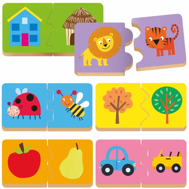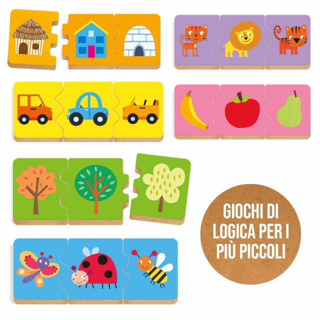A chi somiglia il leone? E la coccinella? Con questo gioco, i bambini sviluppano la capacità di classificare secondo criteri specifici. Grazie alle grandi e robuste tessere in legno, imparano a riconoscere gli animali, i mezzi di trasporto e altro ancora.