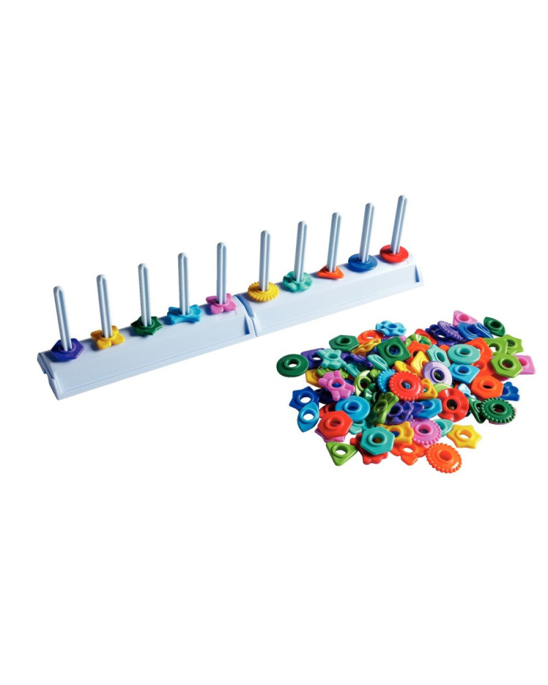 Abachi di plastica a cinque pioli, su cui il bambino infila perle di dieci forme e dieci colori assortiti, che permettono di introdurre, attraverso la manipolazione, le prime nozioni di classificazione. Contenuto: 2 abachi 26 x 8 x 12 cm , 100 perle in 10 forme e 10 colori assortiti . Diametro perla: 4 cm.