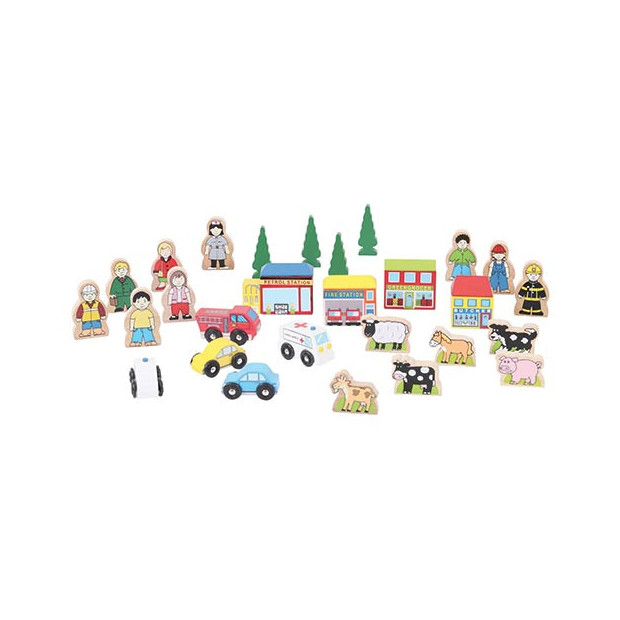 Ogni sessione di gioco diventa unica e divertente grazie a questo set di accessori per auto/trenini in legno da 34 pezzi; Tanti personaggi come animali, veicoli, case, alberi e anche un laghetto per ambientare storie diverse. Disponibili 3 tipologie di set:
