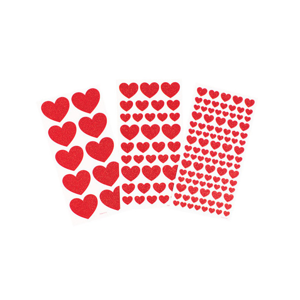 Foglio adesivi cm 10x20 di CUORI in eva glitter in misure assortite da mm 9 a 45. Contiene 146 pezzi.