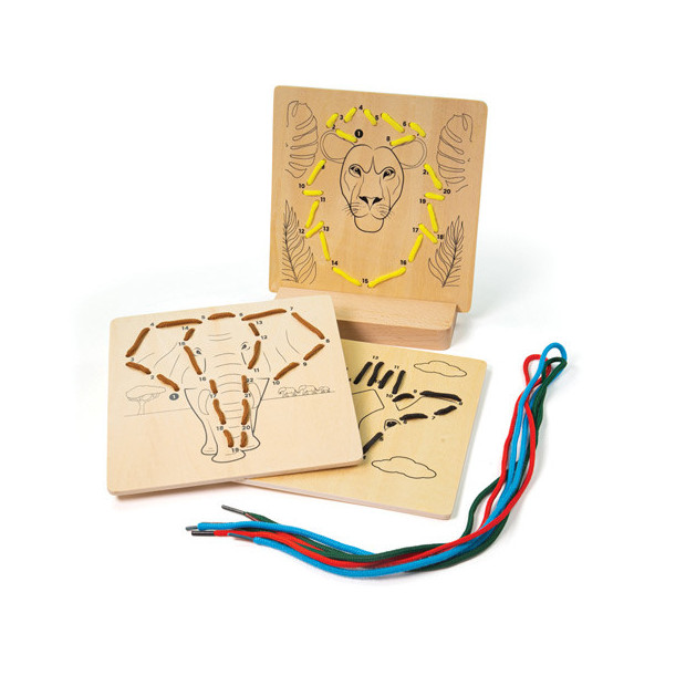 Per completare i disegni degli animali della giungla, il bambino deve infilare i lacci attraverso i fori rispettando l'ordine numerico lungo il percorso. Molto indicato per l'insegnamento dei numeri e per lo sviluppo delle capacità motorie fini, questo gioco consente di mettere alla prova la capacità del bambino di affrontare due compiti contemporaneamente: seguire i numeri e allacciare. Il set include 3 tavole in legno con disegni di animali della giungla e 6 lacci colorati.