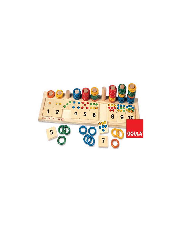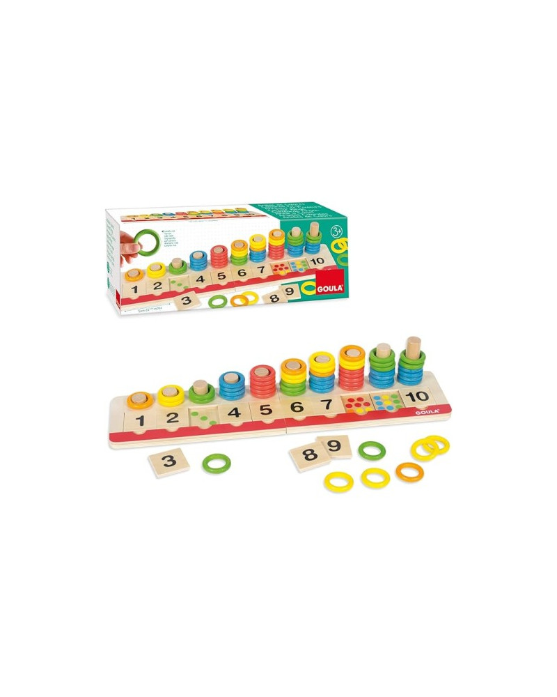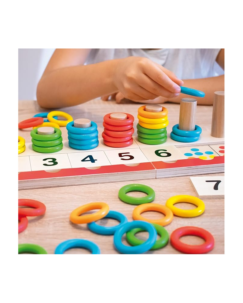 Gioco educativo in legno per imparare a contare da 1 a 10 in modo intuitivo e divertente. Il bambino inserisce gli anelli colorati sulle aste corrispondenti, abbinando quantità, colore e numero. Un’attività che stimola la logica, la coordinazione occhio-mano e la comprensione del concetto di numero. Contenuto: 1 base in legno componibile 51 x 12,5 x 11 cm, 10 colonne numerate da 1 a 10 , 10 tessere in legno con numeri da 1 a 10 , 55 anelli in 5 colori (arancione, giallo, verde, blu, rosso). Totale componenti 67 pezzi.