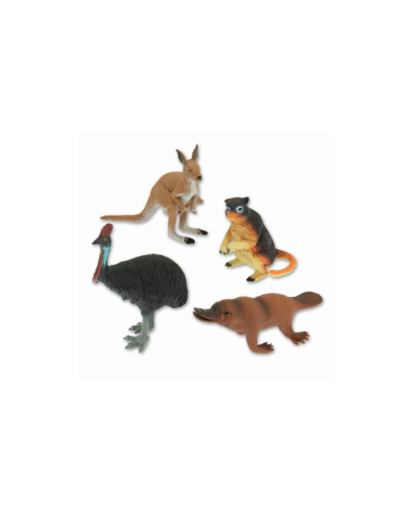 Confezione da 4 animali in plastica dell'Australia, con mappa geografica illustrata e curiosità. Da 3+ anni.