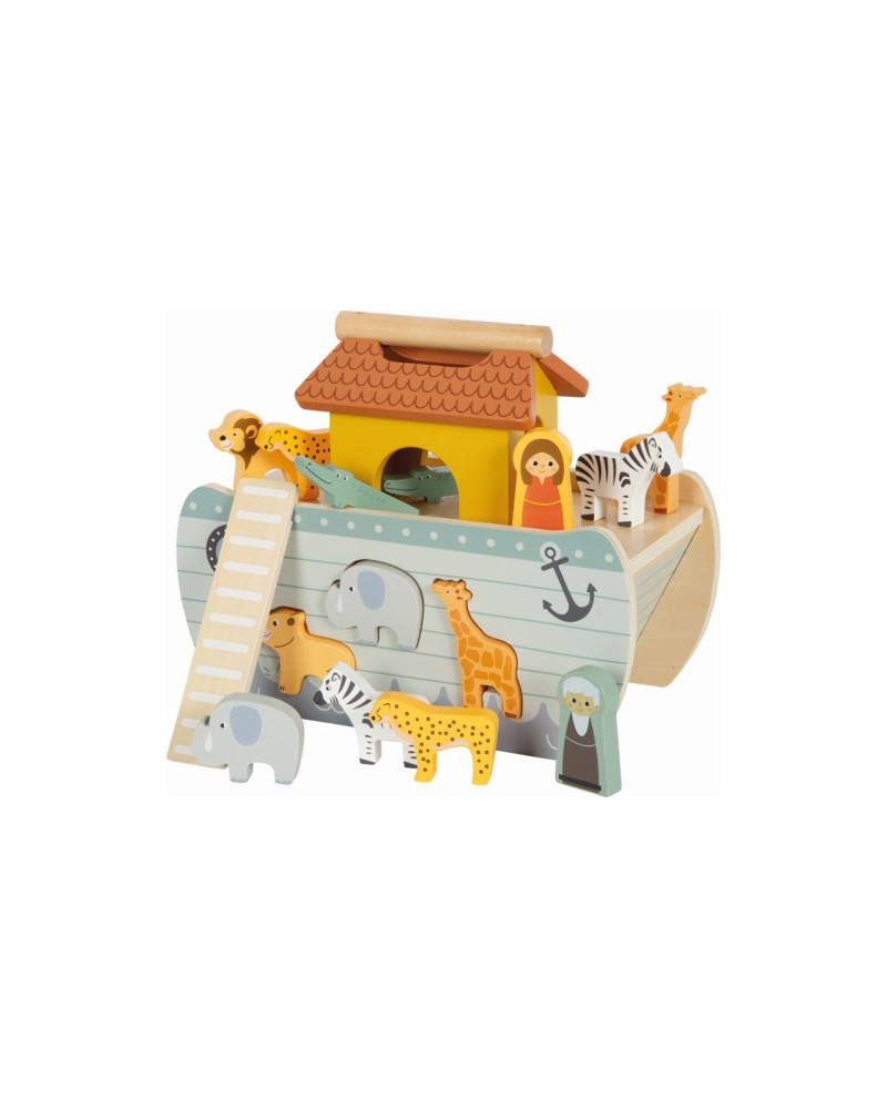 Nave in legno con maniglia e coperchio rimovibile composta da 1 scala, 6 coppie di animali e 2 figure umane. Promuove la fantasia dei bambini spronandoli a raccontare storie e stimola le abilità motorie, la coordinazione occhio-mano e il riconoscimento delle forme. Dimensioni: 27 x 14 x 21 cm, giraffa circa 5 x 1 x 7 cm. Da 1+ anni.