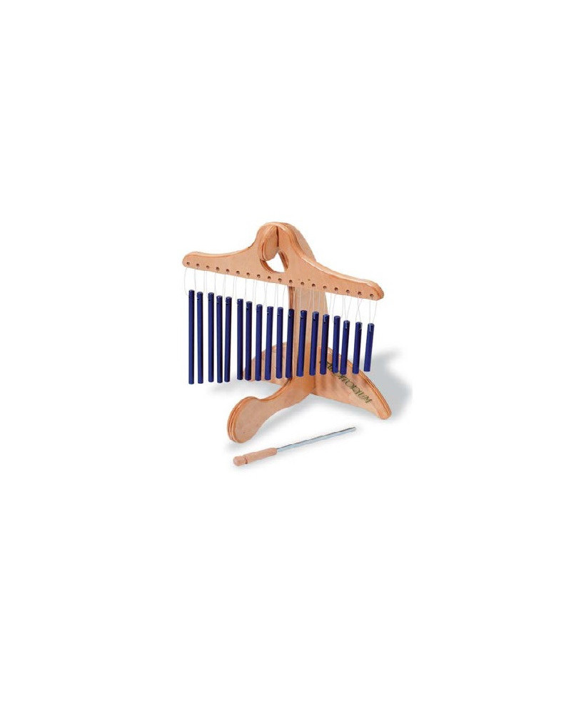 Strumento con 18 barre colorate in lega leggera e un battente in metallo. Supporto in legno verniciato. Altezza 38 cm.