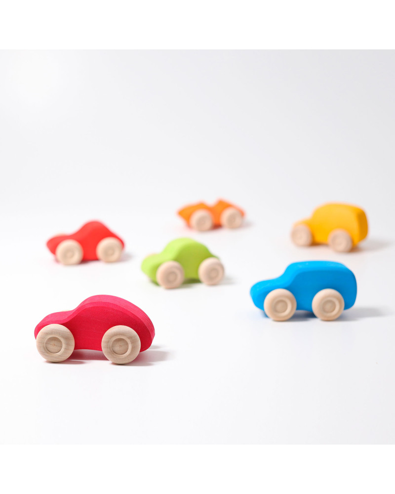 Confezione di 6 auto in legno di tiglio, in colori atossici a base d'acqua. I veicoli possono essere facilmente puliti con un panno bagnato. Lunghezza 10 cm. Da 1+ anni.