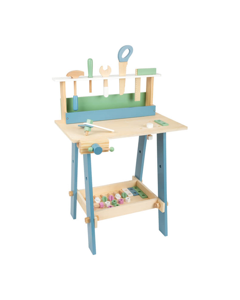 Sono compresi un morsetto da falegname, un righello da falegname, una sega, un cacciavite, una chiave inglese e un martello. Con numerosi accessori come listelli perforati, viti e bulloni. Dimensioni: 53 x 40 x 74 cm, altezza piano da lavoro ca. 54 cm. Da 3+ anni.