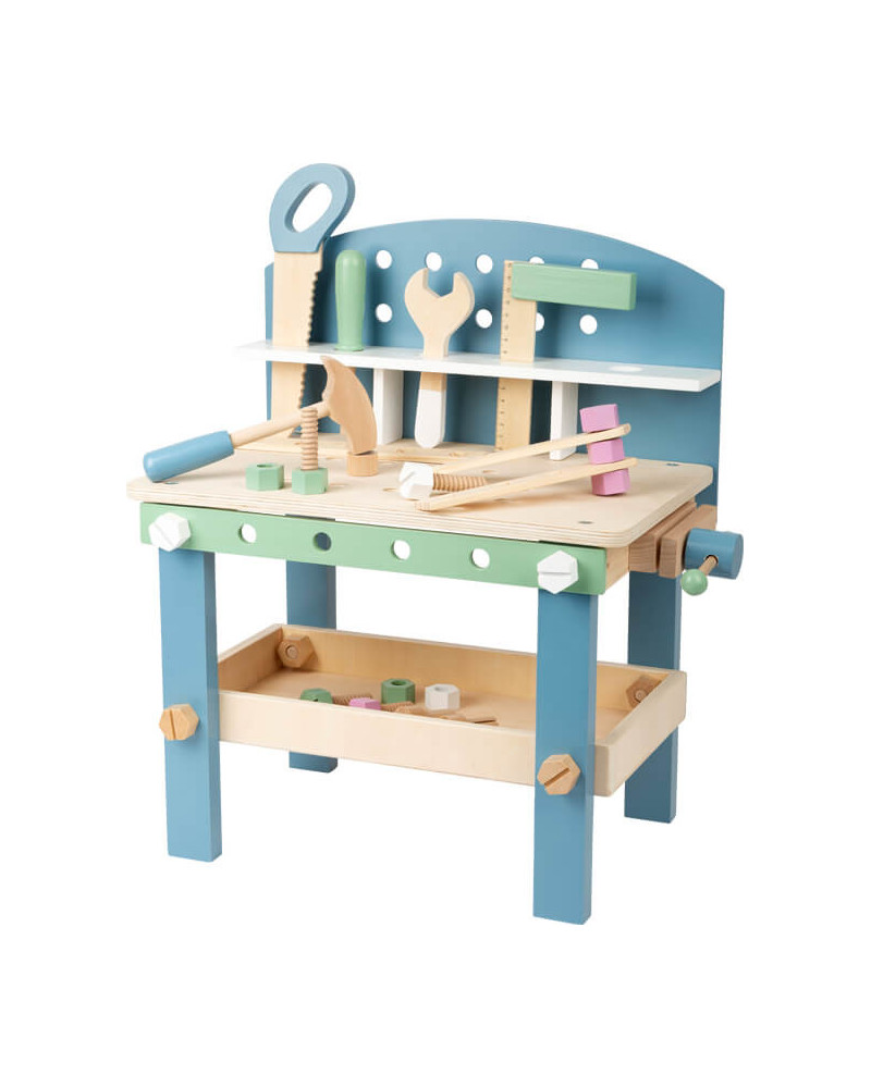 Banco da lavoro in legno, per i piccoli amanti del fai-da-te Accessori: sega, cacciavite, chiave, livella a bolla, martello, tavole, viti e dadi. Realizzato in legno di alta qualità proveniente da foreste sostenibili (100% fsc), delicatamente smaltato con vernici a base d'acqua. Dimensioni:. 40 x 25,5 x 48,5 cm. Altezza piano lavoro 30 cm. Da 3+ anni.