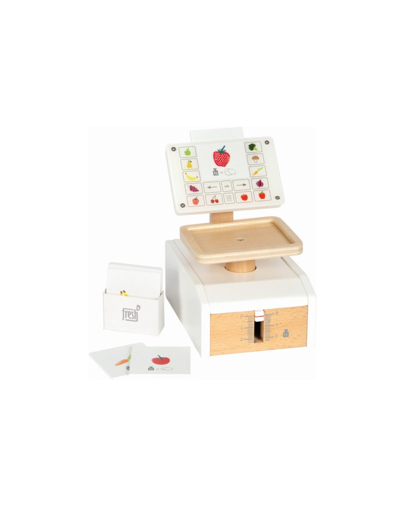 Bilancia in legno con 6 schede dotate di illustrazioni di frutta e verdura che possono essere inserite sopra il "monitor". Le immagini delle monete sulle schede degli alimenti trasmettono le prime nozioni di comprensione dei diversi prezzi. Dimensioni 17 x 11,5 x 18 cm. Da 3+ anni.