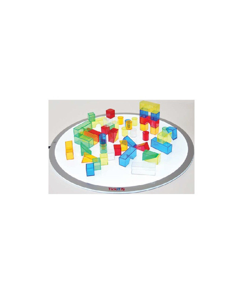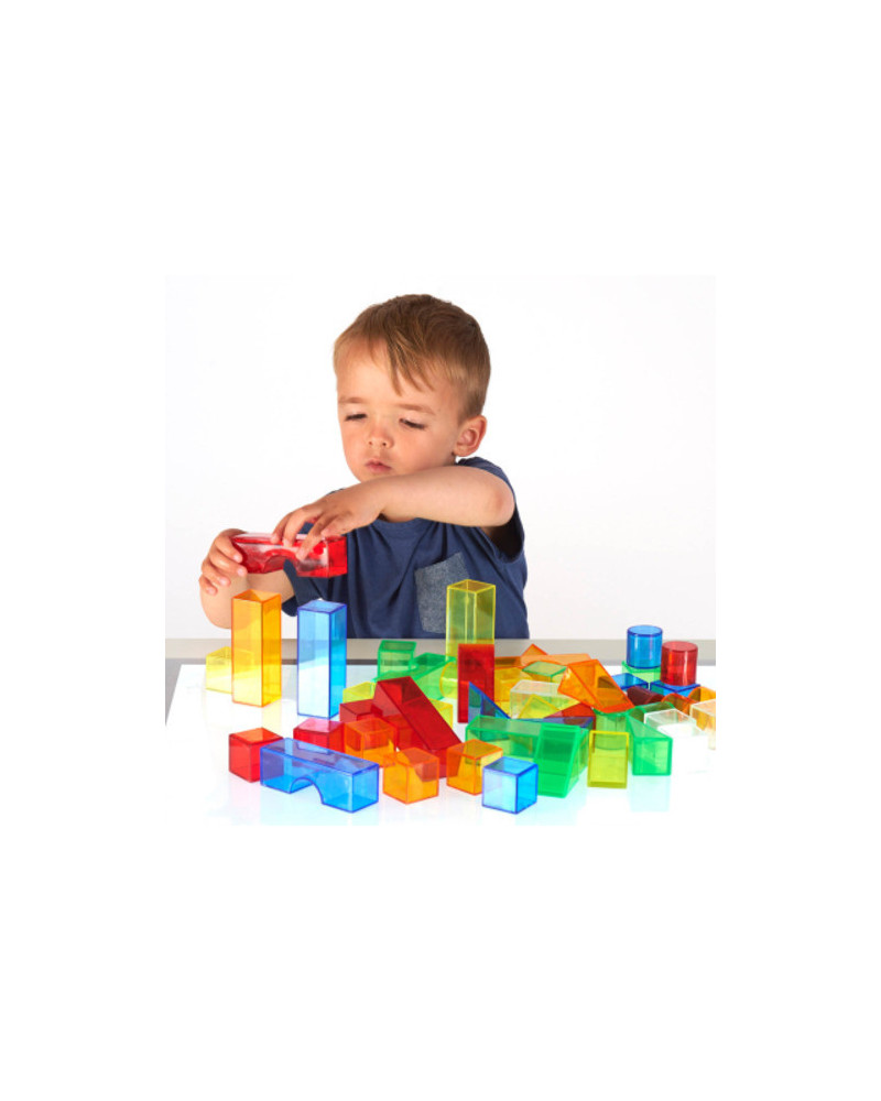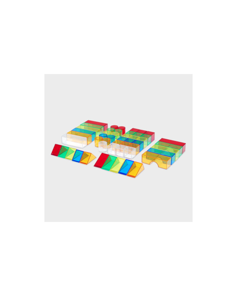 Confezione da 50 elementi di costruzione misti (cilindri, ponti, prismi, cubi e parallelepipedi) in plastica trasparente. Viene fornito in un comodo contenitore. Dimensione del cubo: 3,3 cm