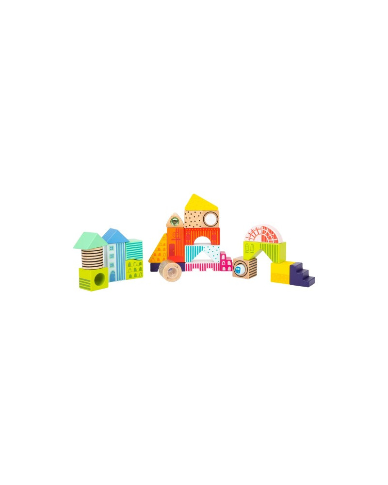 Questa confezione comprende 17 forme fatte di legno di alta qualità. Aiuta lo sviluppo dell'esplorazione dei primi volumi e della coordinazione occhio-mano. Lato cubo 4 cm.