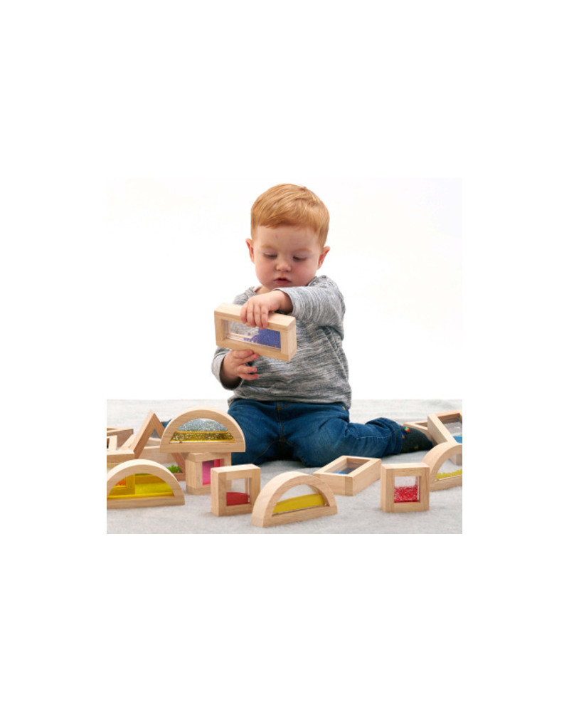 Pluripremiato set composto da 16 grandi blocchi in legno di caucciù, con inserti sensoriali diversi: perline, sabbia colorata, liquidi con glitter e acrilico trasparente. Disponibili in 4 forme (quadrato, rettangolo, triangolo e semicerchio), ogni forma è associata a un colore specifico, per facilitare il riconoscimento e l’osservazione. Perfetti per attività di esplorazione sensoriale, discriminazione visiva, riconoscimento di forme e colori, e gioco creativo. Dimensioni rettangolo: 14 x 7 x 4 cm.