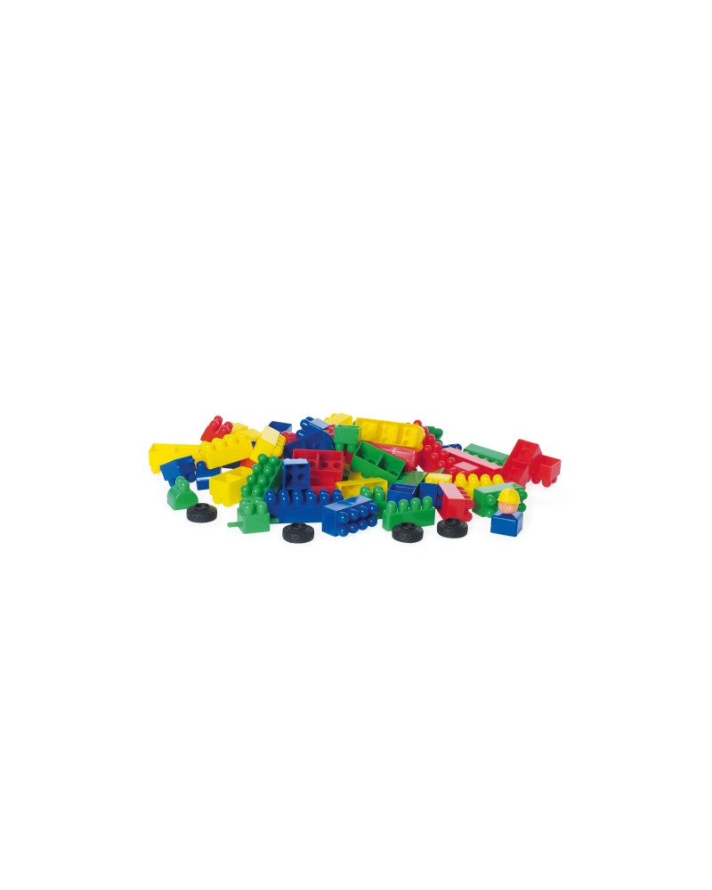 Set di grandi blocchi colorati di varie dimensioni. Comprende anche le ruote per costruire veicoli e una pratica guida con proposte didattiche. In plastica; 120 pezzi. Mattoncino lungo 9 cm.