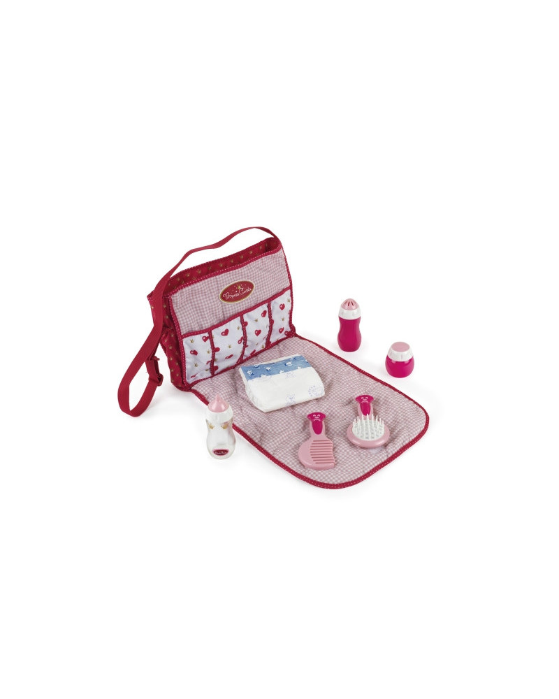 Una pratica borsa con tutto il necessario per il cambio e la cura del bebè. In cotone, con 7 accessori in plastica; chiusa misura 26 x 20 x 7 cm. Da 3+ anni.