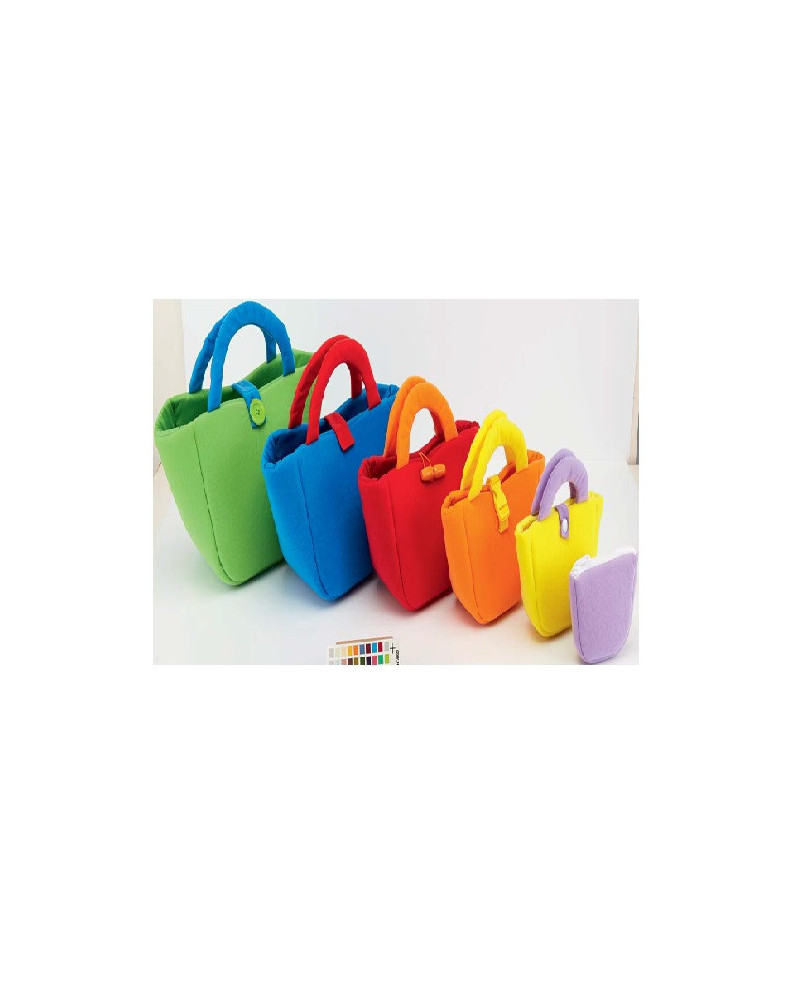 Set di 6 borsine in tessuto imbottito ognuna con un diverso tipo di chiusura: velcro, zip, 3 tipi di bottoni e una clip. Le borsine in diverse dimensioni e colori possono essere posizionate l'una all'interno dell'altra. Dimensione borsa grande 37 x 21 cm. Lavabili a 30°