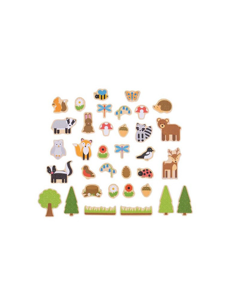 Set da 35 soggetti in legno con retro magnetico da attaccare su qualsiasi superficie magnetica. Dimensione scatola in legno: 15 x 18 x 2,8 cm. Da 3+ anni.