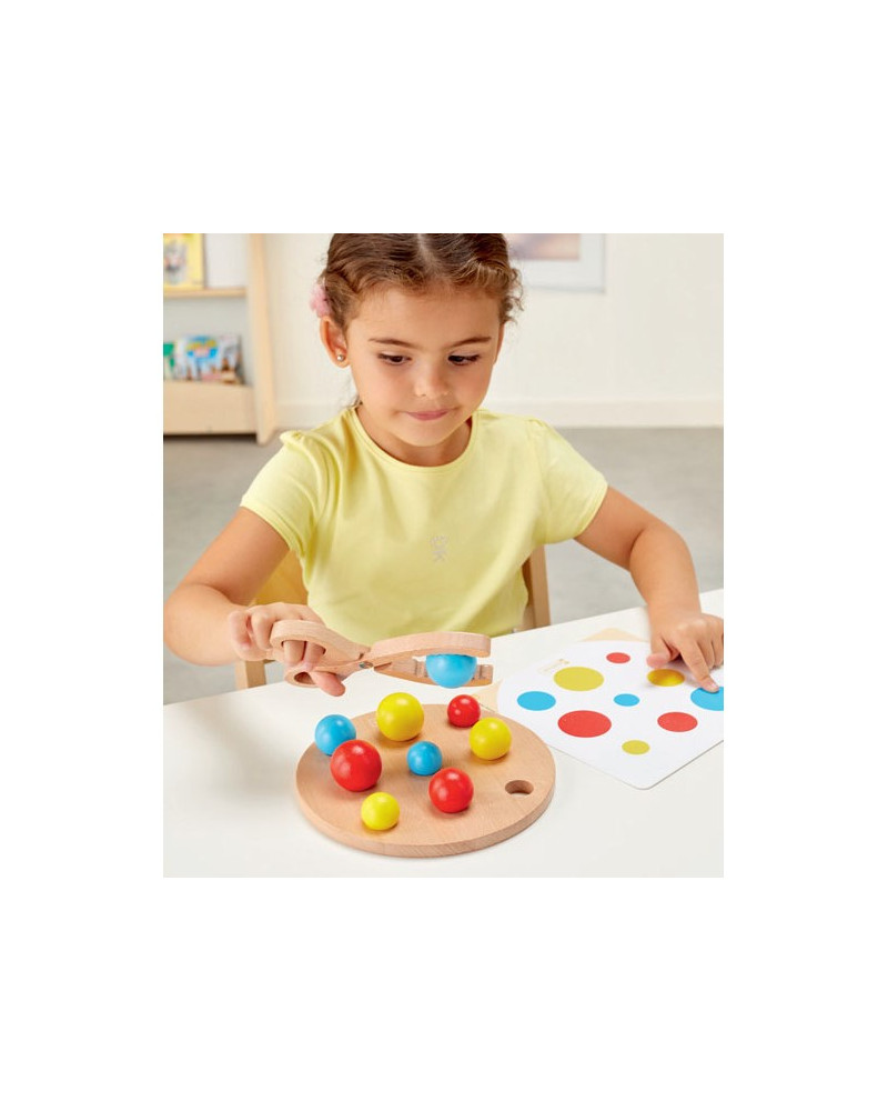 Il bambino posiziona le nove palline, in tre colori e in tre diametri diversi, sulla base utilizzando le forbici in legno, prima liberamente poi secondo le istruzioni sulle schede. Le 6 schede a doppia faccia offrono 12 attività suddivise in due diversi livelli di difficoltà. Il fronte della scheda può essere utilizzato per verificare che il retro sia stato fatto correttamente. La confezione contiene: • 1 opuscolo per l'insegnante. • 6 schede di attività a doppia faccia, con 12 attività 18 x 18 cm. • 1 base e 9 palline in legno verniciato. • 1 paio di forbici in legno verniciato. • Ø/D base: 18 x 1 cm; Ø palla: 2,5/3/3,5 cm; forbici 15 x 6,7 cm.