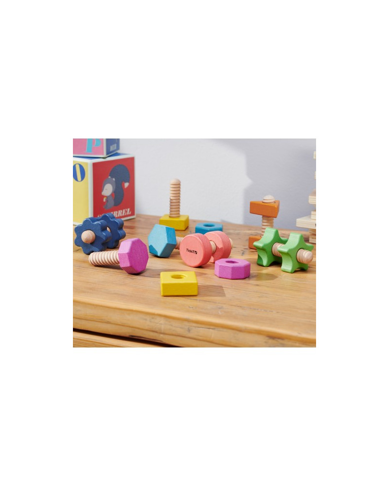 Bellissimi dadi e bulloni in legno massello di faggio in sette forme diverse e nei sette colori dell'arcobaleno. Ogni dado ha un bullone corrispondente per l'abbinamento per colore e forma, e ogni forma ha un numero diverso di bordi, che aumenta da 1 a 8. Da 18 mesi.