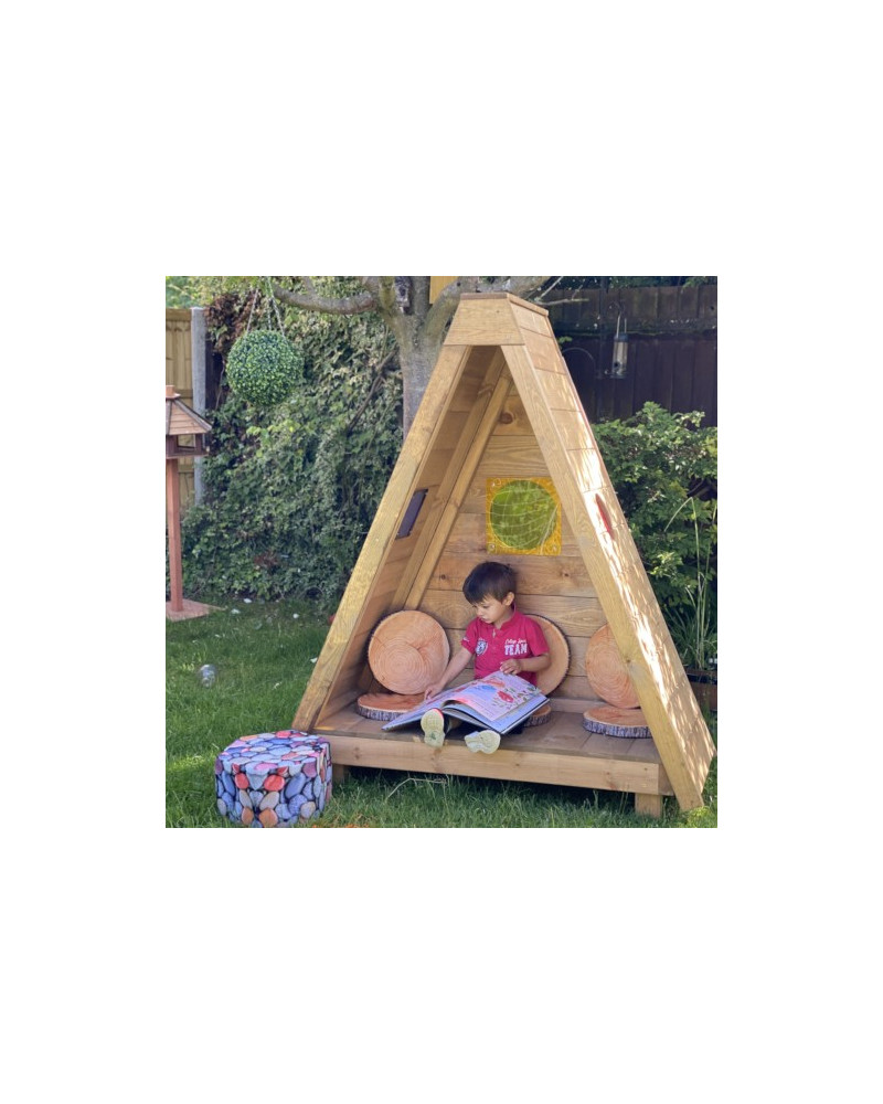 Capanna in robusto legno con finestre in plaxiglas, il rifugio all'aperto perfetto per gli esploratori. Versatile e sicuro, può trasformarsi in un angolo lettura o in uno spazio di gioco creativo. Dimensioni cm. 137x56x160h