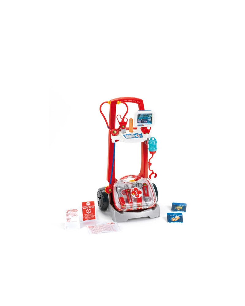 Carrello del medico, facile da montare, con un’ampia gamma di accessori, tra cui sacca per infusione, elettrocardiogramma, guida semplice primo soccorso, cartella febbre, stetoscopoio, martelletto, termometro, 2 forbici, siringa, ecc. In plastica; misura 29 x 24 x 60 cm. Da 3+ anni.