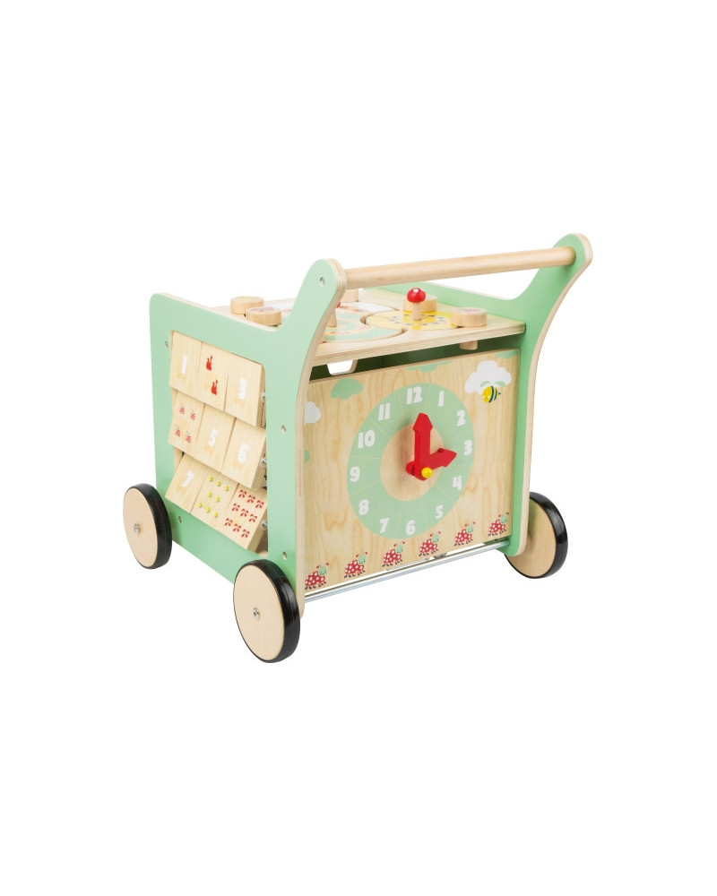 Il ripiano in alto si può ribaltare e si possono riporre così all’interno diversi giocattoli. Grazie al freno di stazionamento si lascia utilizzare in tutta sicurezza. In legno; misura 39 x 40 x 42 cm.