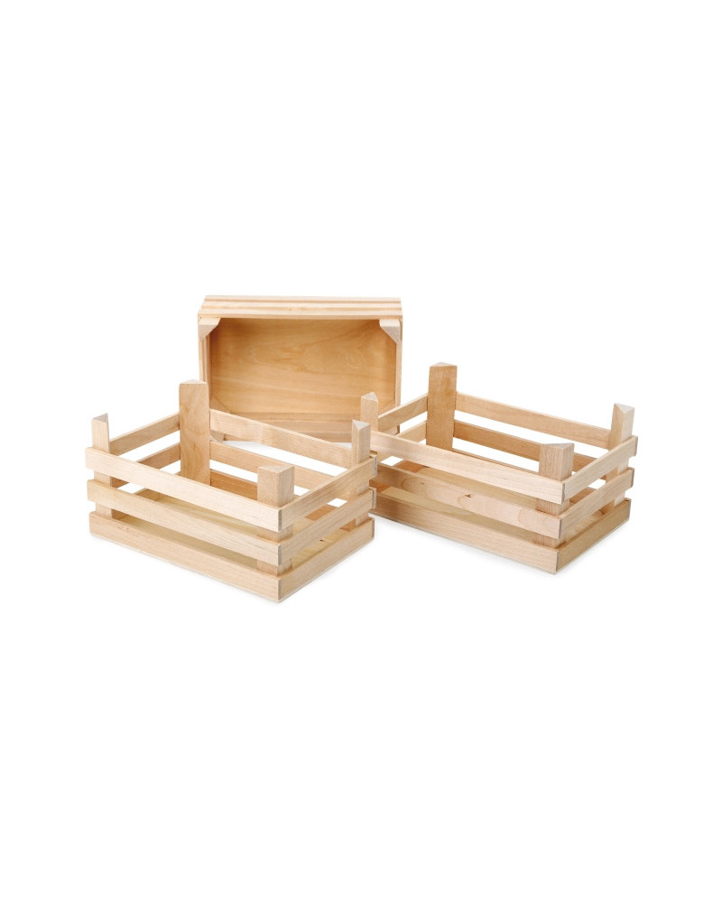 Tre cassette decorative oppure come contenitori per frutta e verdura. Le cassette si prestano perfettamente anche per il negozietto, poiché riempite con frutta, verdura o altra merce, attireranno ancora meglio “i clienti”. Chi ama i colori potrà dipingerla a piacere. In legno; misura 18 x 12 x 9,5 cm.