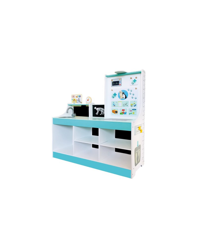 Il tavolo comprende: lavello, rubinetto, carillon in legno, numerose carte, radiografie, funzione radiografica pieghevole, tappetino in tessuto per appoggiarsi, metro, bilancia regolabile e numerosi vani portaoggetti. Incluso nel set: 6 fogli radiografici, 3 carte da gioco, 1 tappetino in tessuto per il tavolo, 3 grandi tabelle di azione, 2 piccole tabelle di azione. Fornito di istruzioni di montaggio. Dimensioni 110 x 112 x 40 cm. Da 4+ anni.