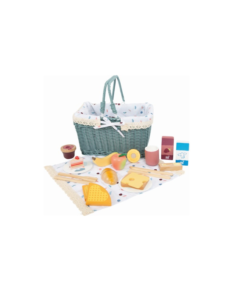 Cestino in plastica con fodera rimovibile con all’interno tovaglietta e 24 accessori in legno. Dimensione cestino 24 x 16 x 15 cm, coltello ca. 14 x 1,5 x 0,5 cm. Da 3+ anni.