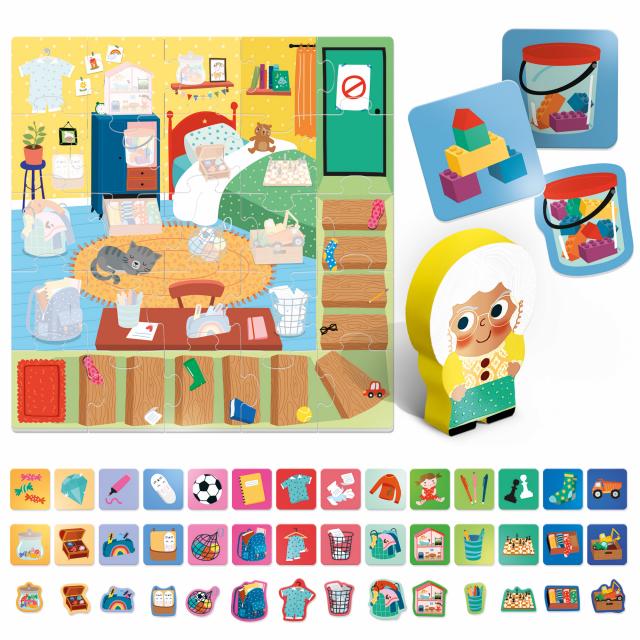 | Contenuto | Puzzle della casa; Puzzle della strada; 16 tessere-oggetto sagomate; 32 tessere-oggetto collocazione; 5 tessere nonna; 1 segnaposto della nonna in legno |