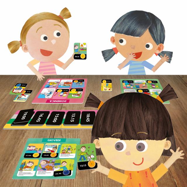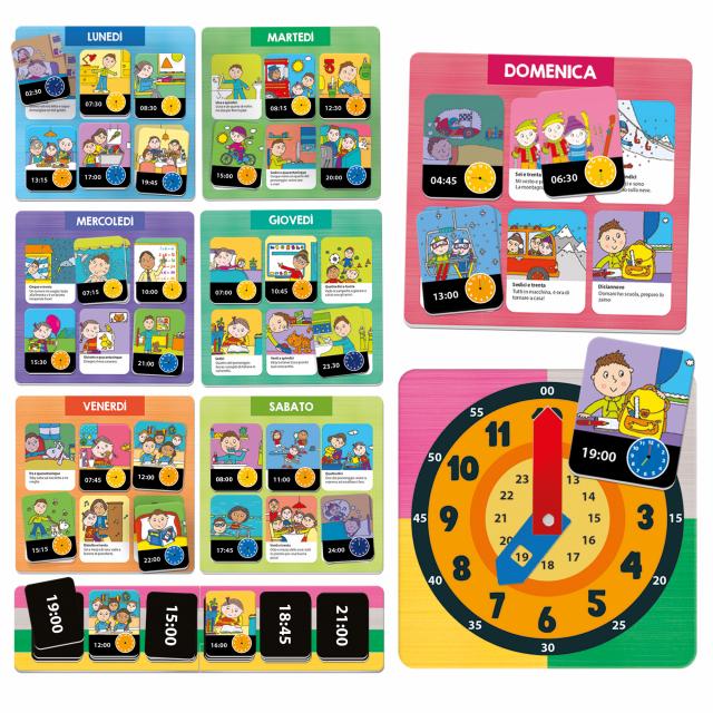 Contenuto 7 cartelle della giornata; 42 tessere delle azioni; Orologio didattico; Plancia delle tessere; Regolamento