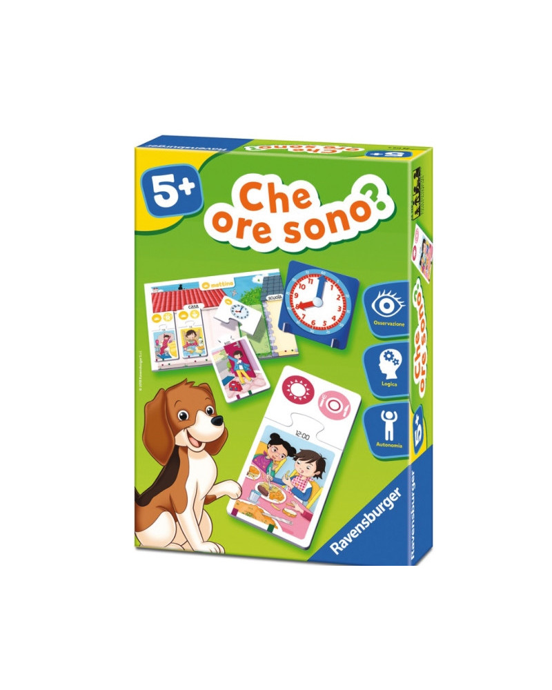 Un gioco divertente e stimolante per capire la cronologia della giornata. Tramite più modalità di gioco, il bambino può ordinare cronologicamente gli eventi e associare le ore a precisi momenti della giornata. Favorisce la comprensione della nozione di tempo e introduce alla lettura delle ore, grazie al grande orologio con le lancette da girare. In cartone; 3 tavole illustrate, 30 carte a incastro, 1 orologio con lancette e piedistallo assemblabile e libretto d’istruzioni. Da 5+ anni.