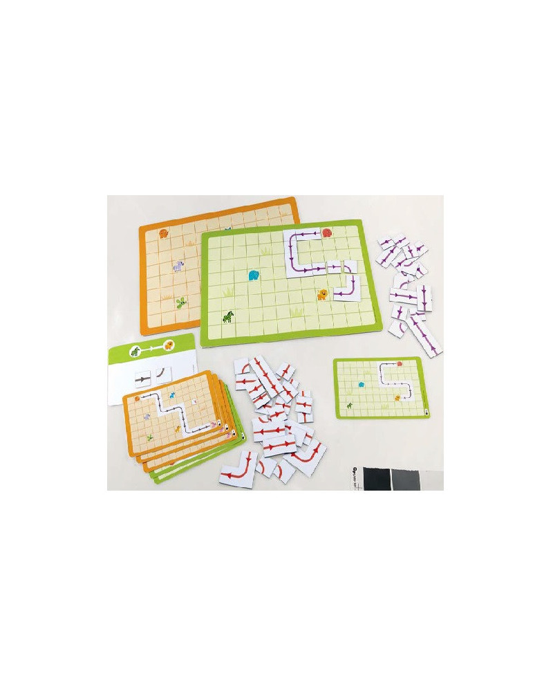 Scopo del gioco è quello di comprendere i concetti di lunghezza o distanza e di direzione. Ogni bambino ha un tabellone magnetico con una griglia da 12 x 18 caselle con illustrati animali della fattoria o selvatici . Gli animali rappresentano i punti di partenza e di arrivo. Il bambino può scegliere liberamente le tessere di direzione per collegare un animale (partenza) all’altro (arrivo). Il gioco però è dotato anche di 24 schede con percorsi divisi in quattro livelli di difficoltà: indicazione del percorso da svolgere con tessere libere o con indicazioni precise sul numero e tipo di tessera. Contenuto: 2 tabelloni magnetici a doppia faccia 32,5 x 22,5 cm, 24 schede con indicazioni sul percorso da svolgere 15 x 10 cm, 46 tessere magnetiche e 1 guida didattica. Da 4 anni in su