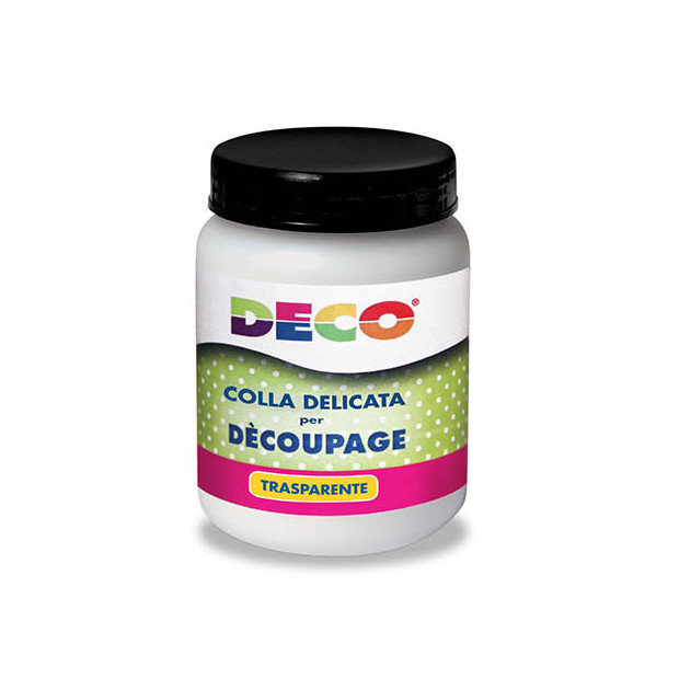 Colle specifiche a seconda del materiale utilizzato per decorare la superficie; Se la decorazione viene realizzata con ritagli di carta, fotografie, cartoline consigliamo di usare la colla forte, trasparente e atossica. Se, invece, vengono utilizzati tovaglioli di carta è consigliata la colla delicata, anch'essa trasparente e atossica. Disponibile in barattolo da 250 ml.