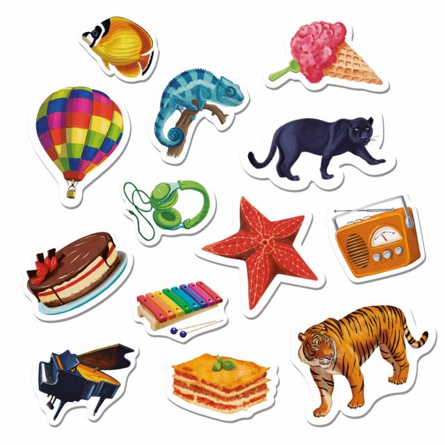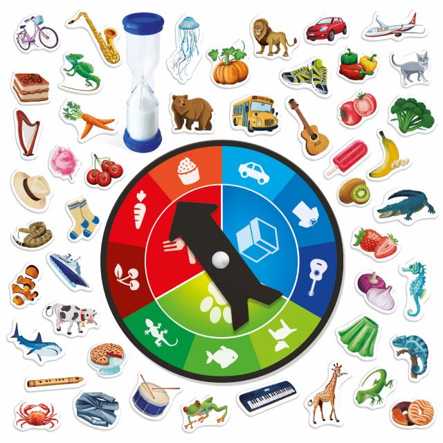 | Contenuto | 135 soggetti sagomati; 1 spinner; 1 clessidra; Istruzioni di gioco |