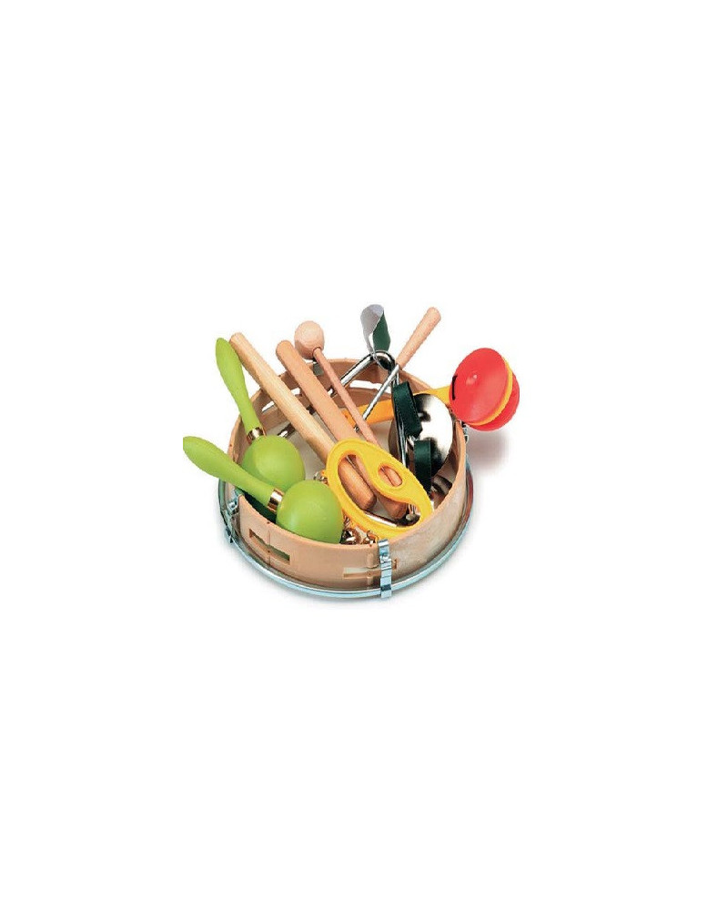Set composto da 11 articoli: • un tamburello 21 cm con battente, • una coppia di mini maracas, • nacchera con manico, • una impugnatura campanelli, • una coppia di clave, • un triangolo 15 cm e una coppia di piattelli a dita.