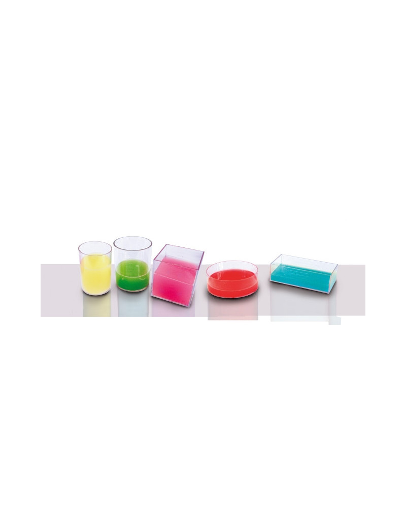 Per visualizzare e rendere comprensibile il concetto di conservazione del volume. Contenitori trasparenti di forme diverse. In plastica; 6 forme base 10 cm.