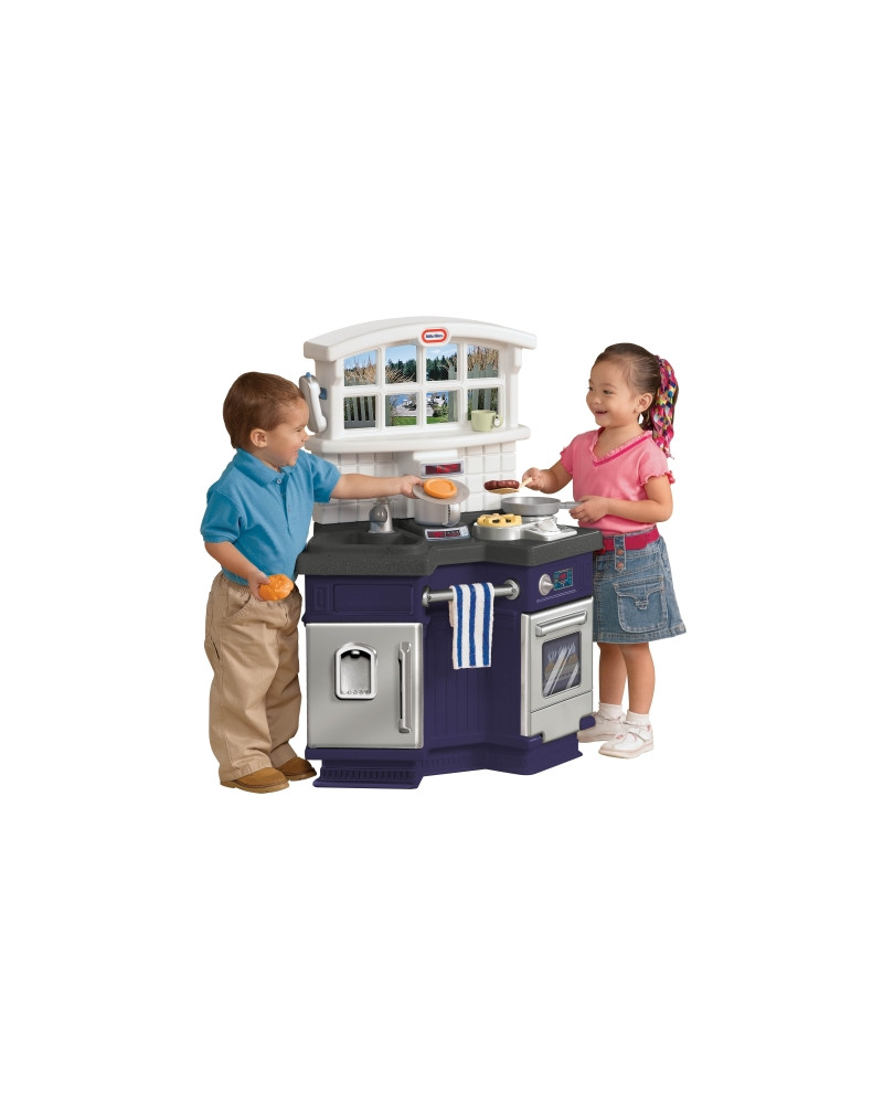 Cucina a due comparti per giocare in due. Comprende un fornello elettronico con suoni di cucina, lavello, forno, frigorifero, ripiano in finto granito e una finestra con vista. 18 accessori da cucina inclusi, tra cui piatti, forchette, cucchiai, coltelli, bicchieri e altro. Dimensioni 74, 5 x 37,5 x 97 cm. Da 3+ anni.