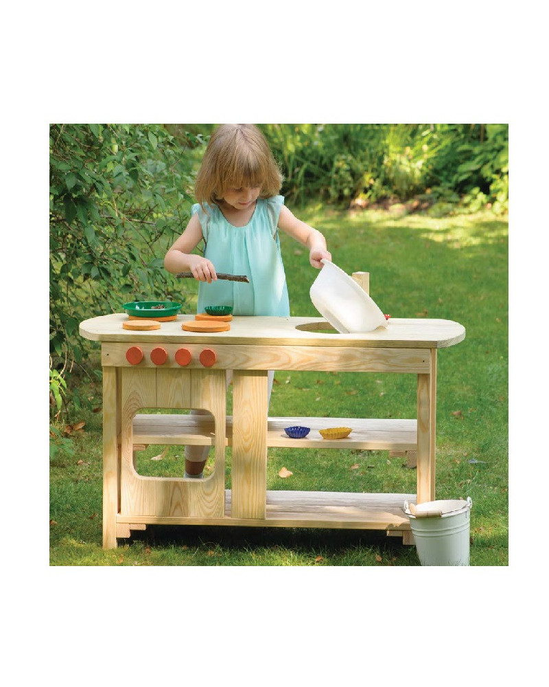 Cucina con struttura in legno di pino, con superficie impermeabile, adatta anche ad ambienti esterni. L' ampia superficie di lavoro offre spazio per il gioco contemporaneo di più bambini allo stesso tempo. Fornito di semplici istruzioni per il montaggio. Realizzato in legno di pino nordico impregnato in autoclave per renderlo resistente alle intemperie. Dimensioni 102,5 x 40 x 55 cm,
