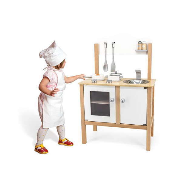 Cucina in robustissimo legno alta qualità composta da lavandino, forno e piano cottura con manopole, pentole, utensili da cucina e ganci per appenderli! Dimensioni cm. 54x30x83,5 h
