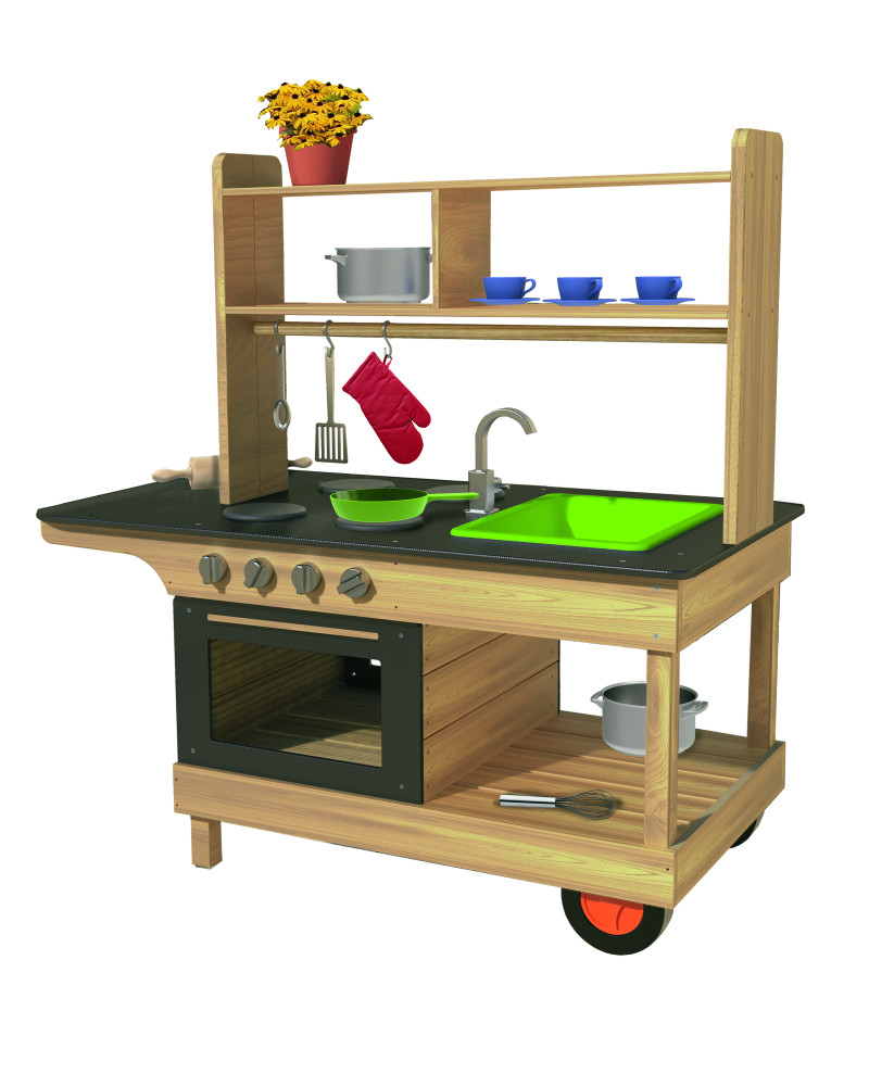 La cucina all'aperto offrirà ore di divertenti attività di gioco di ruolo per i bambini e li trasformerà in chef gourmet. Possono cucinare sulle quattro piastre del fornello e cuocere in forno. La solida cucina è realizzata in legno di alta qualità e resistente alle intemperie. È sicuro grazie alla struttura robusta. Gli ampi spazi di lavoro sono perfetti per il gioco di gruppo e la cucina è accessibile da tutti i lati. Tutte le superfici della cucina sono lavabili e facili da pulire. Può essere facilmente trasportato in diversi luoghi all'interno o all'esterno. Dimensioni del prodotto: 106 x 60 x 108 cm