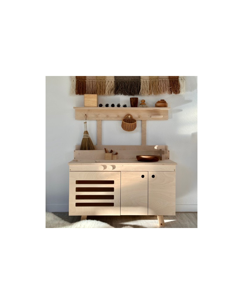 Cucina con molti dettagli dotata di una stufa con due piastre elettriche, un forno con sportello ad apertura laterale, una teglia da forno rimovibile e manopole di controllo rotanti. C’è anche un lavello rimovibile con un rubinetto. Altezza del piano/lavello 55 cm. Dimensioni 87 x 40 x 98 cm. Da 3+ anni.