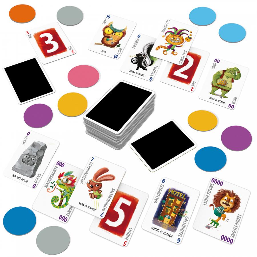 Tra personaggi buffi, scambi obbligati e colpi di scena, chi perde i cinque gettoni viene eliminato. Chi resisterà fino alla fine? Un gioco di carte per tutti dal meccanismo avvincente, da 4 fino a 12 giocatori!