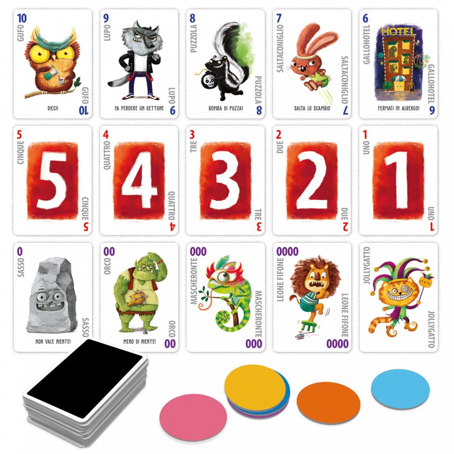 Contenuto: 1 mazzo da 55 carte; 36 gettoni; Regolamento