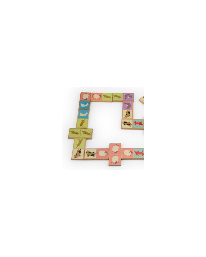 Domino in legno di faggio contenente 28 tessere con 7 illustrazioni di animali. Dimensioni delle tessere: 3,5 x 7 x 0,7 cm. Da 2+ anni.