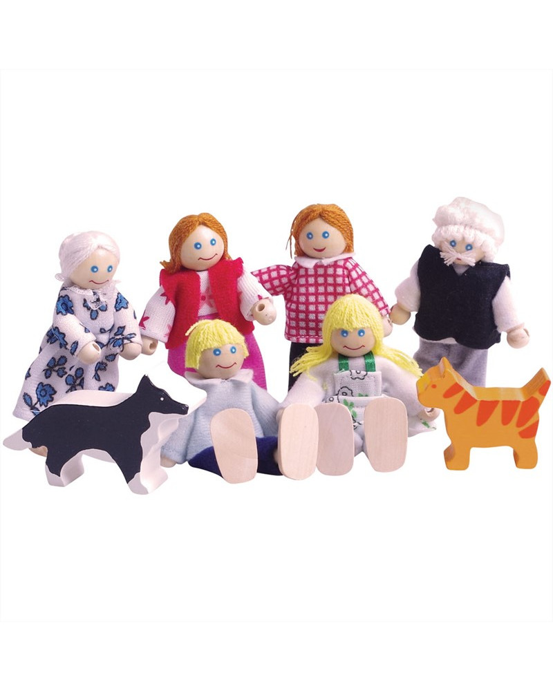 Composto da 6 pupazzi e due animali. Realizzato con materiali di alta qualità e di provenienza responsabile. Altezza bambola 11 cm. Da 3+ anni.