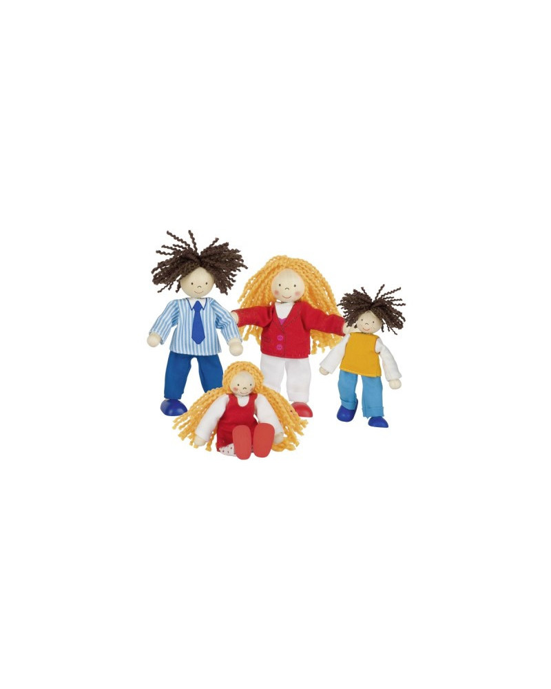 Quattro personaggi in legno (teste, gambe e braccia) con arti flessibili in filo di ferro ricoperti da intreccio di tela, vestiti in cotone. Altezza mamma 10 cm. Da 3+ anni.