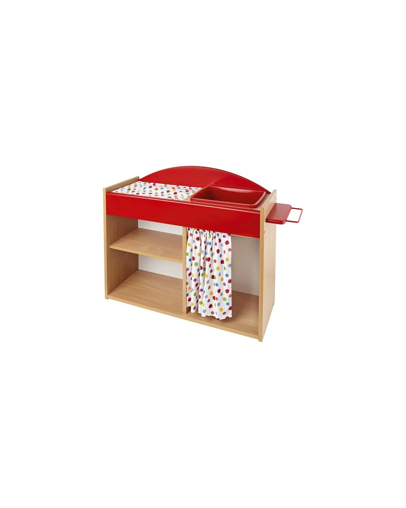 Un’unità per lavare e cambiare il bambino e per riporre accessori e vestiti su mensole o appendiabiti. Finitura rossa in melaminico faggio. Dimensioni 98 x 32 x 72 cm. • H fasciatoio: 60 cm