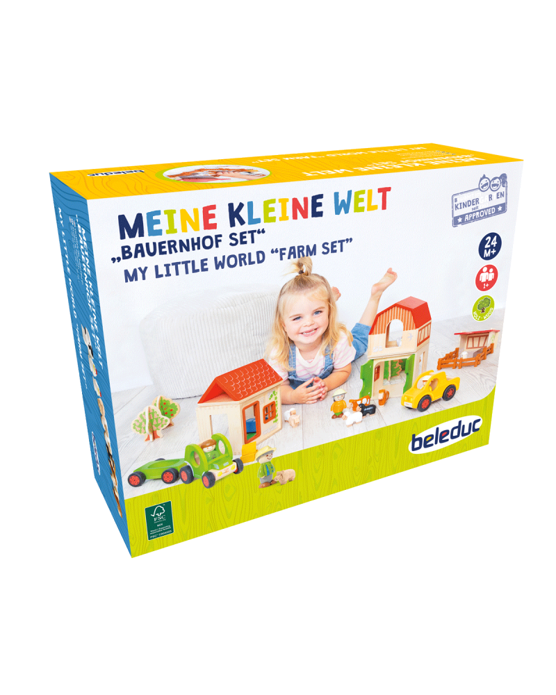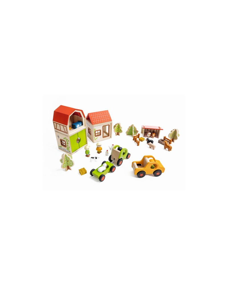 Fattoria con un fienile, una stalla, un’auto, un trattore con rimorchio, una casa per la famiglia, 2 personaggi e 10 animali. Il set comprende 38 pezzi in legno di faggio proveniente da foreste certificate FSC e bioplastica. Favorisce la comunicazione, l'imitazione dei suoni e l'interazione sociale. Dimensioni: 14,8 x 12 x 12,8 cm. Da 2+ anni.